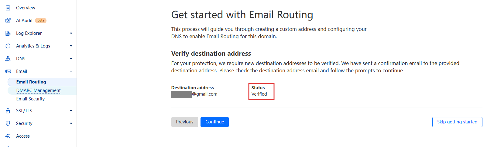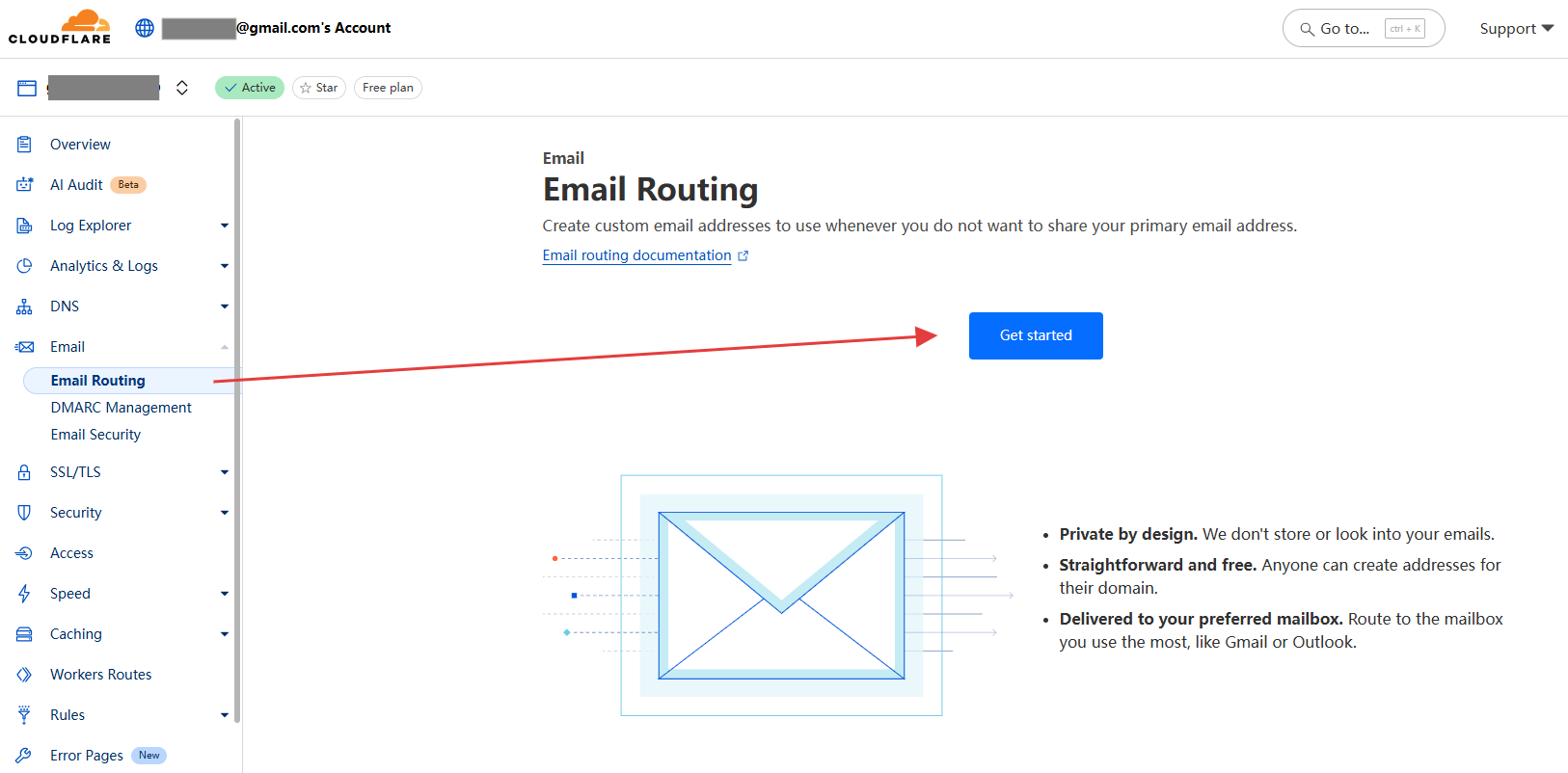 第 1 步:在 Cloudflare 需要配置邮箱的域名中,打开左边栏 Email Routing 菜单项,点击开始 Get Started。