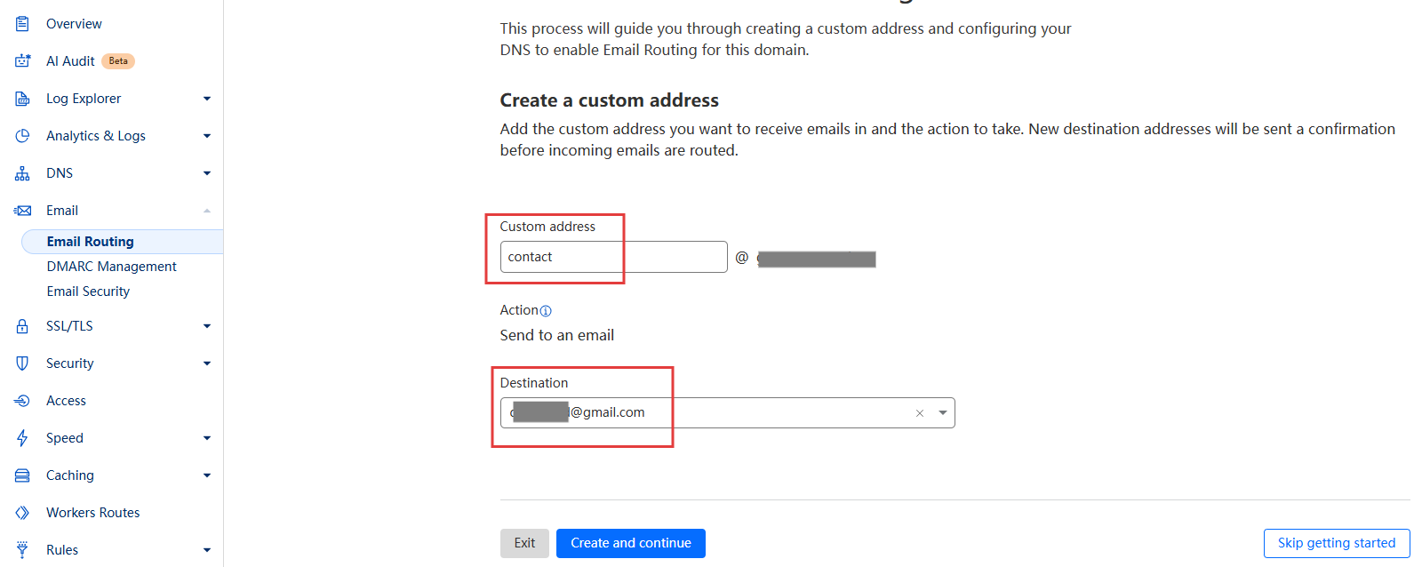 第 2 步:配置想要命名的邮箱地址。同时配置收件时转发到你自己可以收信的邮箱地址。点击创建和下一步。