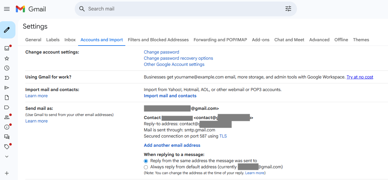 第 2 步:选择账号与导入。找到 Send mail as 区域,添加另一个邮箱地址。