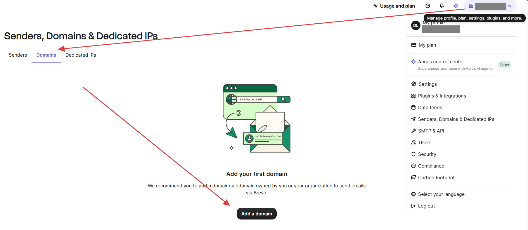 第 2 步:登录进去后,在右上角打开菜单,找到 Senders, Domains & Dedicated IPs