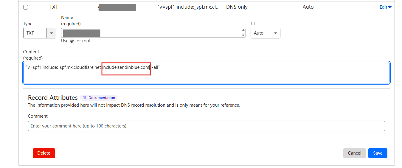 第 3 步:在 Cloudflare 的域名解析中,找到值为 v=spf1 ... 的 TXT 解析记录,在原先记录中加入 include:sendinblue.com,它是 Brevo 的 SPF 授权域名。