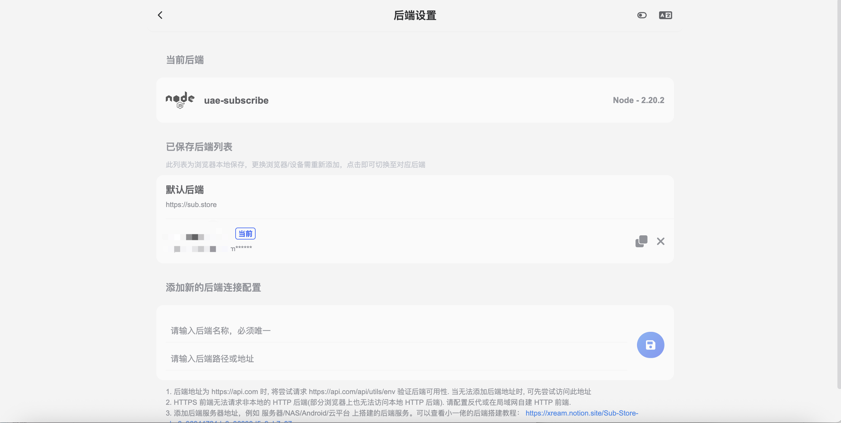 该工具分为前后端,前端界面如下,主要是提供可视化界面。后端一般搭建在公网服务器上,在前端中输入后端的 api 链接,即可对接到后端,组成完整功能的 sub-store。
